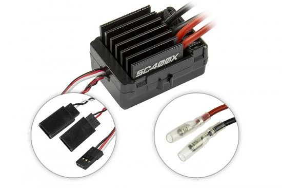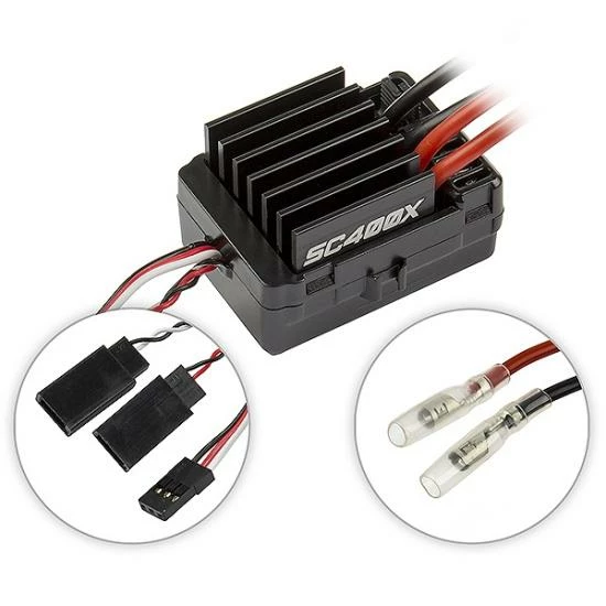 The SC400X is 2-3S compatible and equipped with advanced features intended specifically for crawlers and trail trucks. Fully proportional forward and reverse gives precision control on rocky terrain while an option of 0%, 50%, or 100% drag brake setting helps maintain control on steep ascents and descents. Convenient dual auxiliary power leads can be used to power LED lighting or other scale accessories.